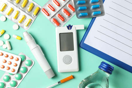 Digital glucometer, lancet pen and pills on color background. Diabetes concept