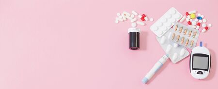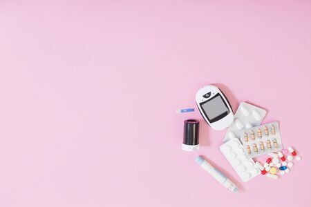 Diabetes concept with medical equipment on blue background with copy space. Glucose test glucometer, diabetic medicines, stripes and insulin syringe pen, top view