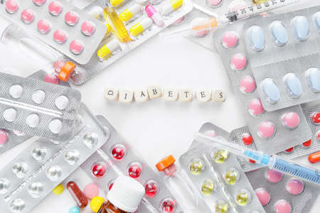 Paper with written diagnosis as diabetes type 2 with medicine in blister pack and syringes for insulin injection.