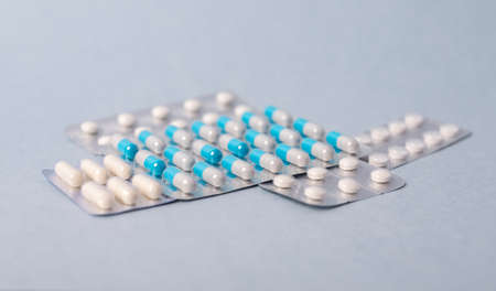 Multi-colored tablets of different shapes and colors. Placer pills and a stack of blisters. Medical concept, treatment of diseases and viruses, pharmacy, healthcare, vitamins.