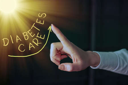 Writing note showing Diabetes Care. Business concept for prevent or treat complication that can result from the disease Digital arrowhead curve denoting growth development concept