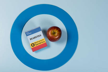 Fake medicine box with the name of the disease Diabetes and a glucometer