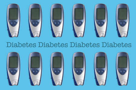 repetition of apparatus for measuring blood glucose on blue background with the word Diabetes written