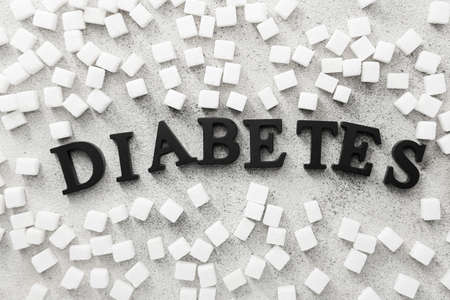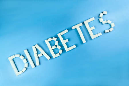 Diabet diabetes word made of sugar cubes on the table background. Banner.