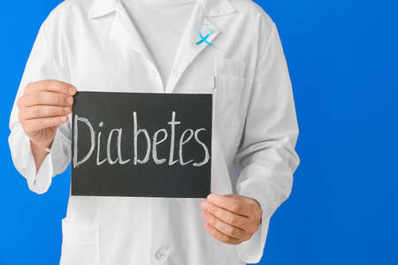 On the index finger - the diabetes icon - a blue circle, against the background of the inscription diabetes. World diabetes day concept