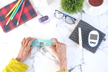 Diabetic patient doing glucose level blood test using ultra mini glucometer and small drop of blood from finger and test strips.