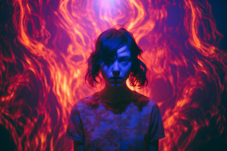 photo of beautiful woman with mixed red and blue lighting , generative AI