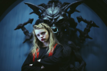 a young girl standing in front of a demon statue