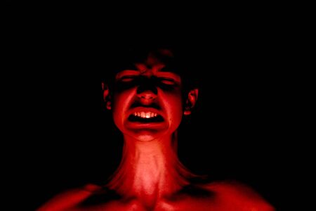 Portrait with a red treatment of a teenager on a black background. Concept of pain and tension