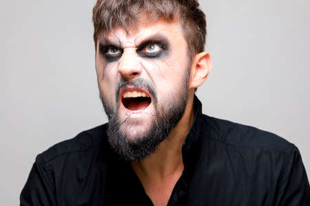 Portrait of a man with a beard and a menacing look with undead-style makeup on All Saints' Day on October 31