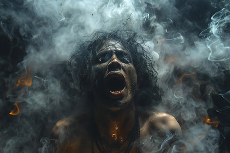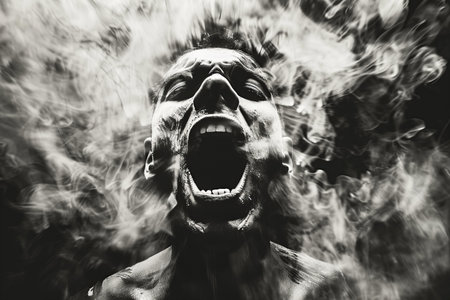Featuring a man screaming in front of smoke, high quality, high resolution