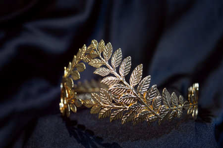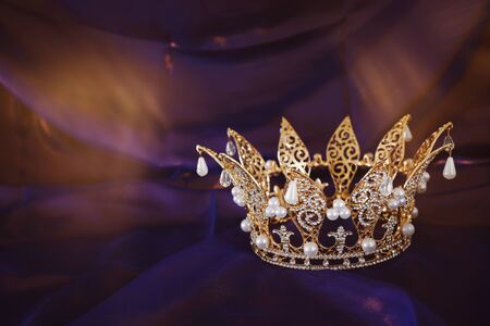 Luxury golden royal crown on smooth fabric fo queen and princess, Symbol of power and wealth, authority. Beauty contest