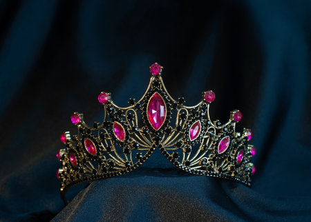 Royal Diadem, crown with ruby, red gemstones on velvet background