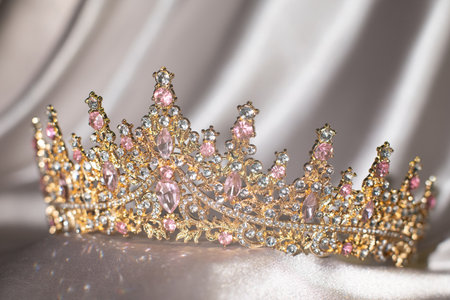 Royal crown for queen and princess, beauty contest. Morganite gemstones