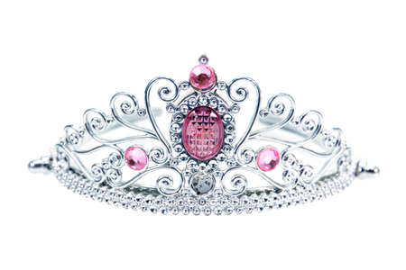 Tiara decoration with pink diamonds isolated on white background. Plastic crown beauty decorative with gems and diamonds isolated