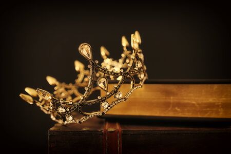 low key image of beautiful queen/king crown over old book and wooden table. vintage filtered. fantasy medieval period