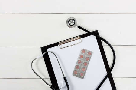 Medical concept on table with pills and stethoscope