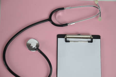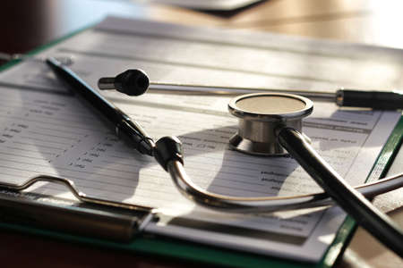 Stethoscope with clipboard and pen on desk, Healthcare and medical concept