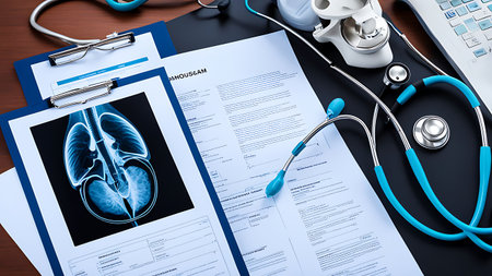 A detailed medical document featuring X-ray images of a human chest and leg, accompanied by a stethoscope and a pen, highlighting medical examination and diagnosis processes.