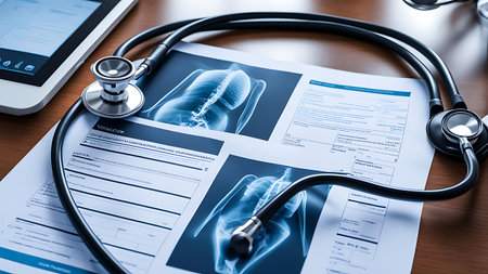 An image featuring a detailed X-ray of lungs, a stethoscope, and a clipboard with medical charts, representing a healthcare and medical concept.