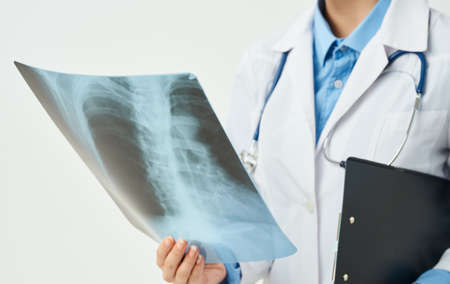 Chest x-ray in a doctors hand in a medical gown