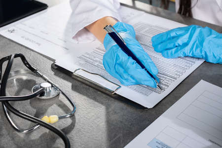 Open medical folder hand in rubber gloves