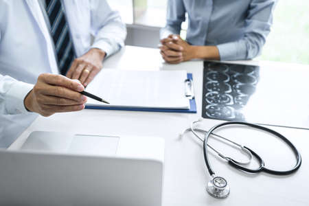 Professor Doctor consulting with patient discussing something and recommend treatment methods, Presenting results on report and x-ray film, Medicine and health care concept.