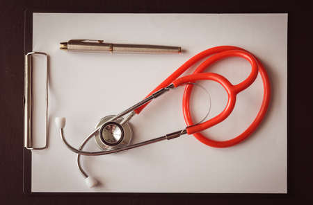 close-up. image of a stethoscope, pen and clipboard on the doctors desktop.