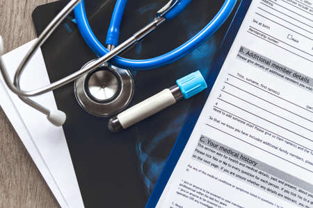 A part of COVID-19 Virus test Requisition form and Stethoscope on the background of lung x-ray. Concept of protection from Coronavirus. Closeup.