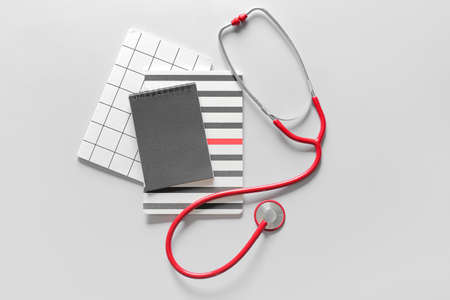Modern stethoscope and notebooks on light background