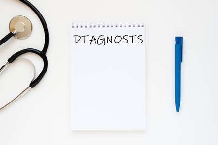 diagnosis concept. the inscription diagnosis in a notebook on a table next to a stethoscope
