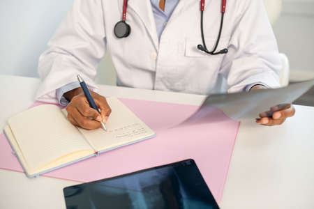Close-up of female doctor making notes at table with x-ray image. African American general practitioner sitting at table and holding radiological picture. Pulmonology concept