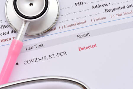 COVID-19 detected result, laboratory report of COVID-19 testing by using RT-PCR method, the result showed detected or positive, sample from nasopharyngeal swab