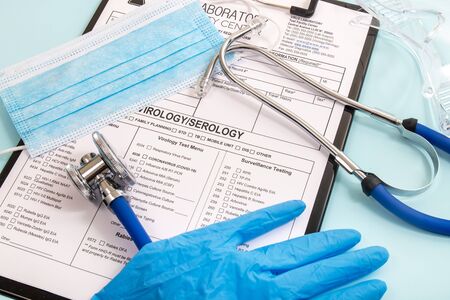 Various virus and laboratory test report concept, for coronavirus, rabies, hepatitis and others with face mask and stethoscope and other items.