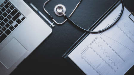 Medical accessories. Doctor stethoscope, hospital healthcare infographic charts and syringe, notebook on dark background. Acoustic medical device, notebook computer keyboard