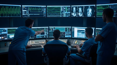 A cutting-edge medical monitoring room with multiple screens displaying detailed patient imaging and vital signs, reflecting advancements in medical diagnostics.