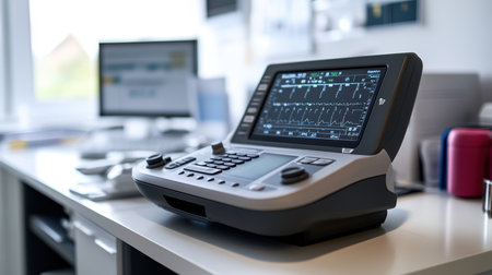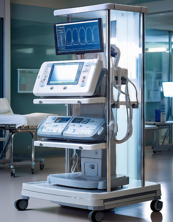 A detailed view of advanced medical technology including monitors and diagnostic tools, set in a clinical environment, emphasizing vital signs and healthcare innovation.