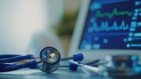 Close-up of a stethoscope on a desk beside a heart monitor, illustrating the intersection of healthcare and technology in a clinical setting.