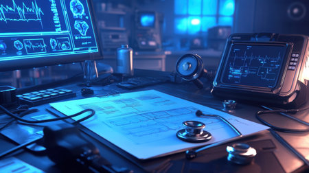A high-tech medical device rests on a digital interface in a modern laboratory, showcasing blue glow and advanced technology to highlight innovation in healthcare research.