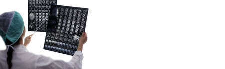 Doctor looking at MRI film of human brain in operating room