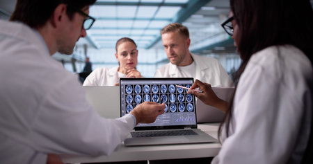 Team Of Diverse Medical Professionals Studying Brain Scans On Laptops.