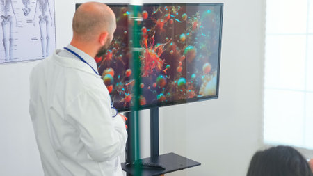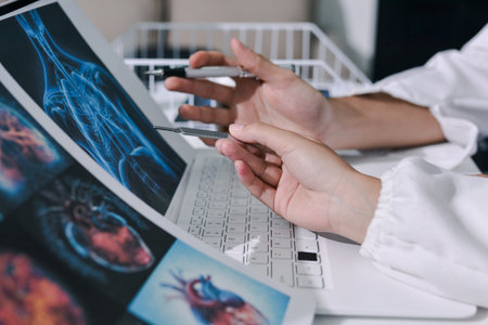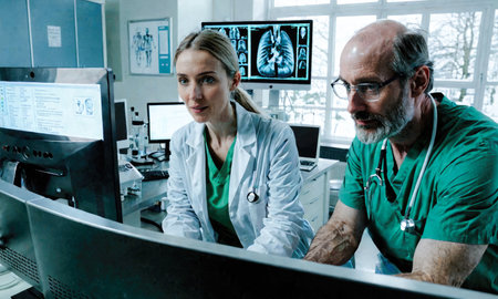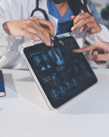 Radiologists review human anatomy scans to develop effective treatment plan. Teamwork and expertise in radiology, analytics and diagnostics ensuring comprehensive healthcare solutions.