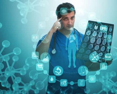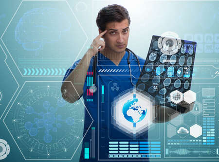 Portrait of handsome young doctor looking at a brain x ray. Doctor giving a diagnostic. Brain ct scan.