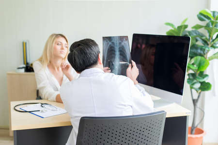 Doctor explaining and checking x-ray film to female patient in hospital,Back view and selective focus