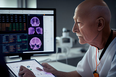 Selective focus closeup of biracial male radiographer working with head CT X-ray scan image