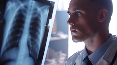Healthcare professional evaluates chest radiograph showing lungs and ribs, focusing on respiratory health and disease detection.