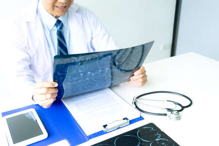Professional doctor sit and look to mri x-ray film exam case to help patients to have good health