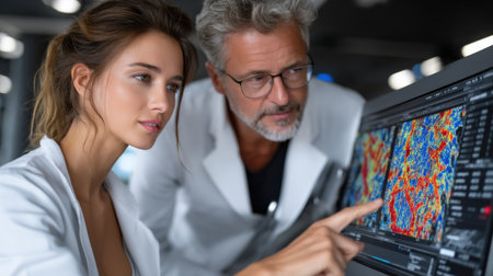 A man and a woman are examining a computer screen displaying a graph. The woman is pointing at the graph, and the man is looking at it intently. The graph appears to be a complex mathematical equation