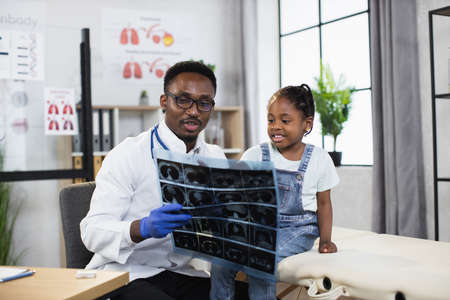 Handsome friendly smiling black-skinned male doctor pediatrician, showing results of x-ray CT scan for little african kid girl in modern medical center during appointment