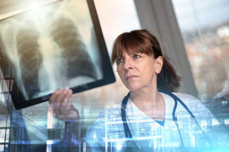 a doctor analyzing a chest x ray with a stethoscope in a hospital environment with a serious look